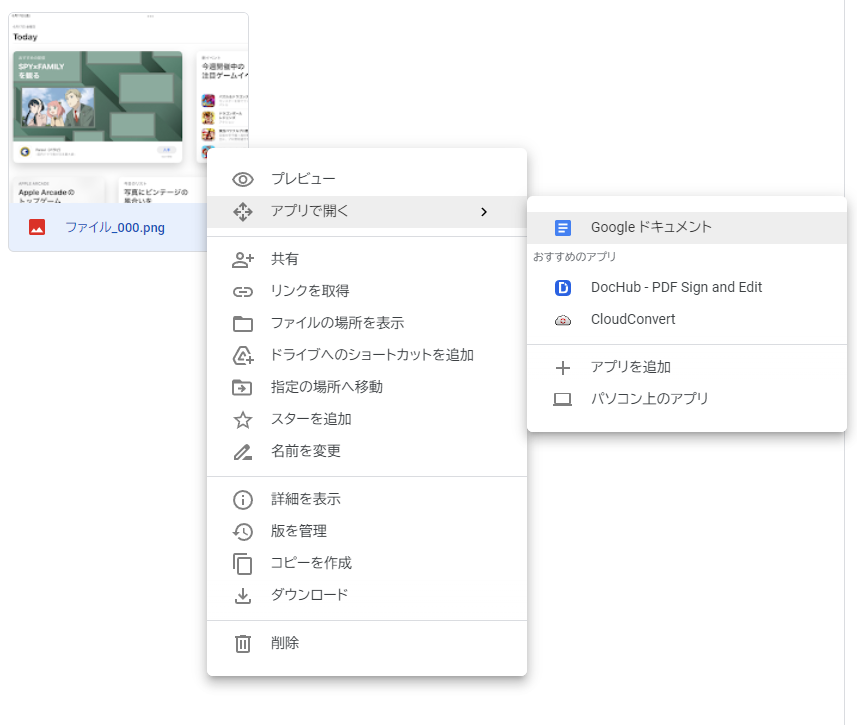 先程アップロードした画像を右クリックし、「アプリで開く」> 「Google ドキュメント」で開く。